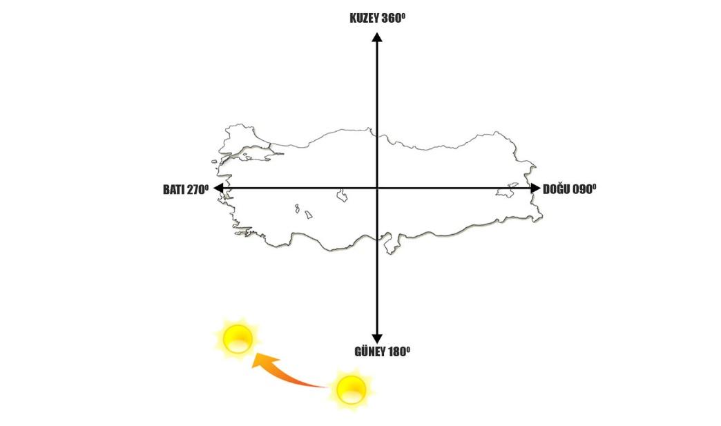 [2] 45 derece olarak kabul edilmesi, sadece 23 Eylül-21 Mart tarihlerinde dünyamızın dik olduğu durumlar için geçerli olmaktadır. Bu açı bizlere aynı zamanda günün öğleden sonraki bölümünün iki eşit parçaya ayrılması şeklindeki bir prensibi de ortaya koymaktadır ki bu yılın bütün günleri için geçerli olacaktır.
